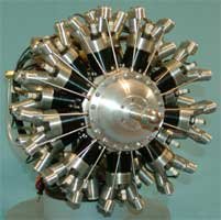 Front view of the 18 cylinder showing the general arrangement of a double row radial engine. Two banks of 9 cylinders, arranged 180 deg. opposed, intake and exhaust pushrods, overhead valves, enclosed rocker arms, spark plugs, and ignition harness.