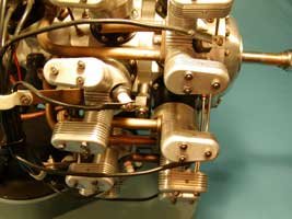 Rear view of the cylinders showing the engine rear casting, wire attachment, two distributors, intake and exhaust pipe attachment to the cylinder head and the intake pipe attachment and the support stand.