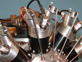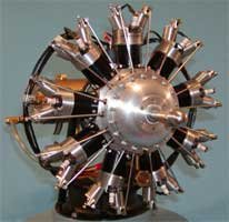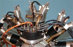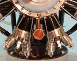 Front view of the 9 cylinder showing the general arrangement of a radial engine. Single bank of cylinders, intake and exhaust pushrods, overhead valves, exposed rocker arms, spark plugs, ignition harness and the support stand.