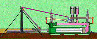 Courtesy of Kurt Spitzer web site Two high pressure, simple expansion cylindersSome have wondered why there is a set of plans for a Mississippi river steamboat engine on the same web site as radial engines. The reason is that In 1984, my father vacationed on the Delta Queen steamboat and became fascinated by the California cutoff valve gear. All of the detail pictures he took, did not come out. Working from memory, and from the text of an International Correspondence School textbook, he was able to build a model of a similar engine. It is an unusual engine and the only model of its type available to the model engine hobby. The original engines are horizontal cross compound with a HP Cylinder of 26"diameter, the LP Cylinder is 52" diameter, the stroke is 10 feet. The engines are rated at 2000 horsepower at 13 RPM. Model size 22 inch wide 38.25 inch long 14.0 inch high Cylinders Bore - .875 inch Stroke - 5.125 inch Paddlewheel Size 13.5 inch diameter 12.0 wide 12 blades 1 casting - 5 required Valve GearCalifornia Cutoff Valve gear
